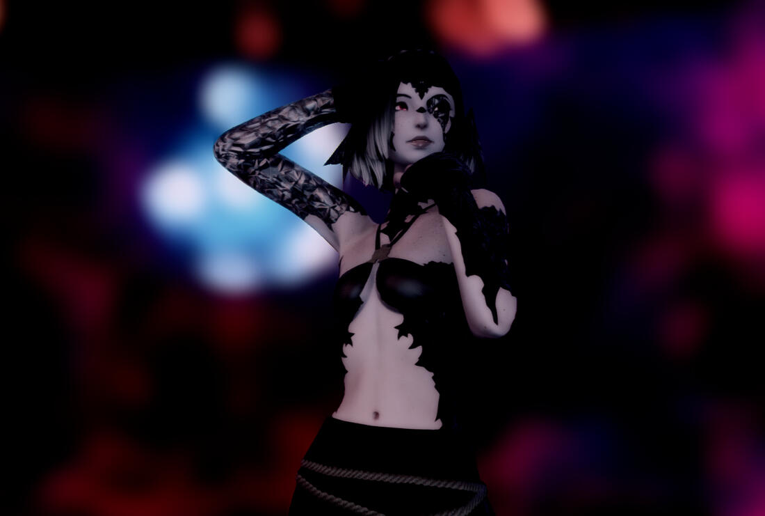 -physical appearance-hair- short and black with grey/white highlightseyes- one pink eye with a vibrant limbal ring and a black eye without (usually covered)skin- pale blueish-grey with black scales covering her entire bodyclothing style- varies, usually prefers looser fitting, flowy clothesother- Prominent black coloured crystallization around her left eye and on her right arm (picture example below)